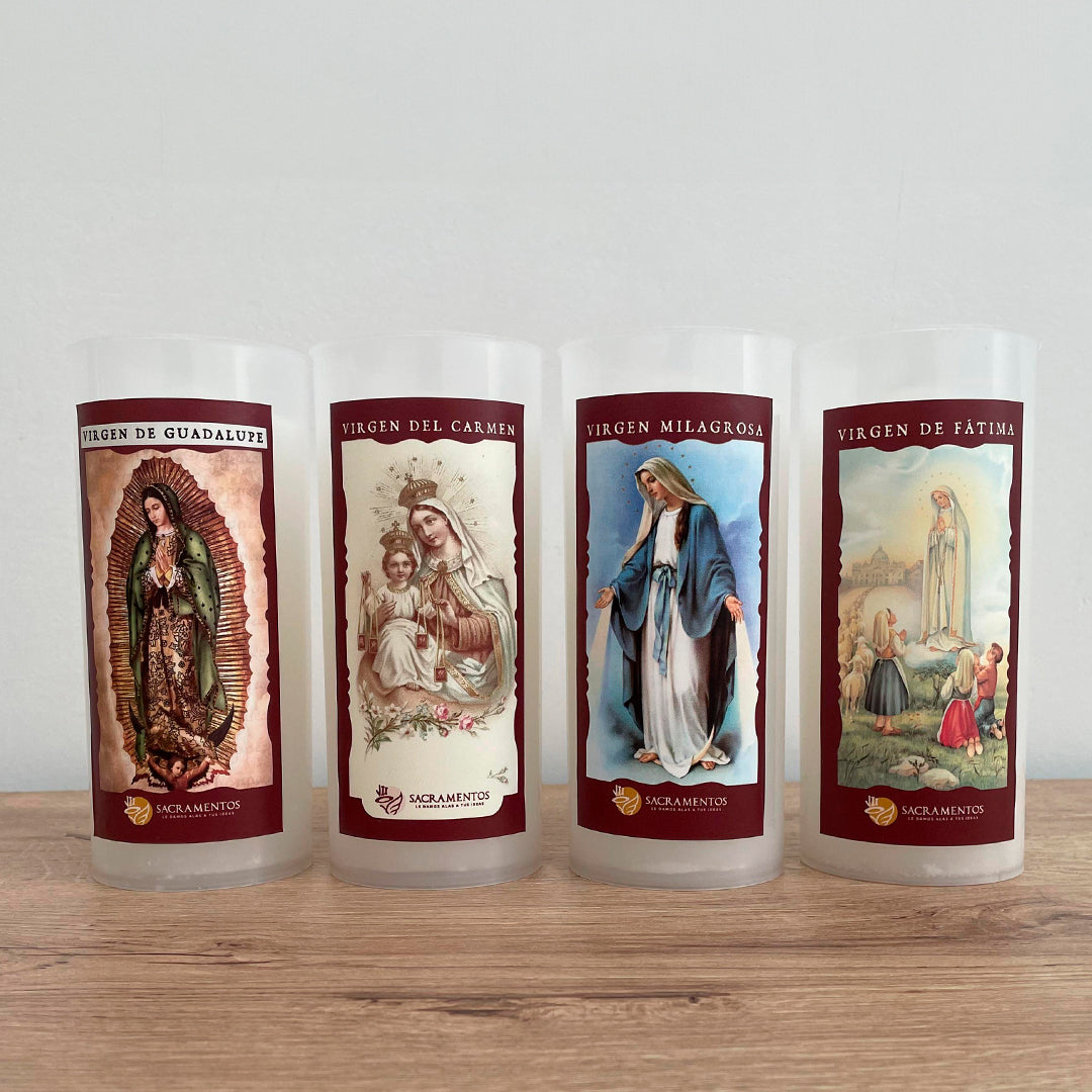 En la parte frontal, esta vela presenta la imagen de una virgen, como la Virgen de Guadalupe, Fátima, Carmen o Milagrosa, añadiendo un elemento de devoción y protección al ambiente. En la parte posterior, cuenta con los misterios del rosario de cada día, proporcionando una guía para la oración y la meditación.