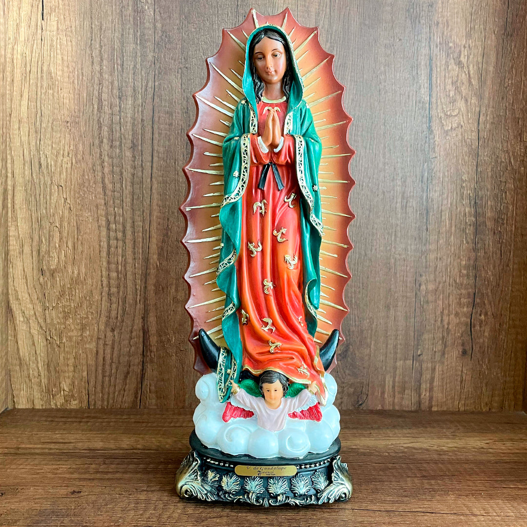 Embellece tu hogar con la presencia celestial de la Virgen de Guadalupe mediante esta cautivadora estatua importada en resina italiana. Con una altura de 40 cm, esta imagen es mucho más que una simple pieza decorativa; es un símbolo de fe, protección y devoción para tu hogar.