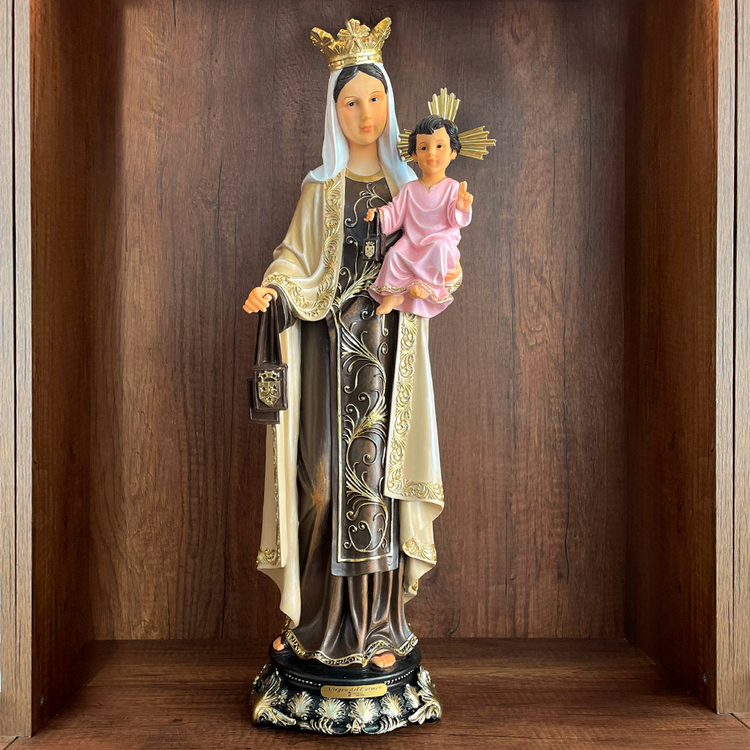 Transforma tu hogar en un refugio de paz y protección con la presencia de la Virgen del Carmen, estatua importada en resina italiana. Con una altura de 60 cm, esta representación de la Virgen del Carmen es mucho más que una simple obra de arte; es un símbolo de fe, amor y devoción que ha tocado los corazones de millones en todo el mundo.
